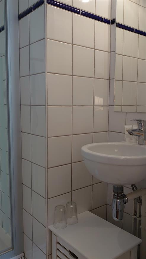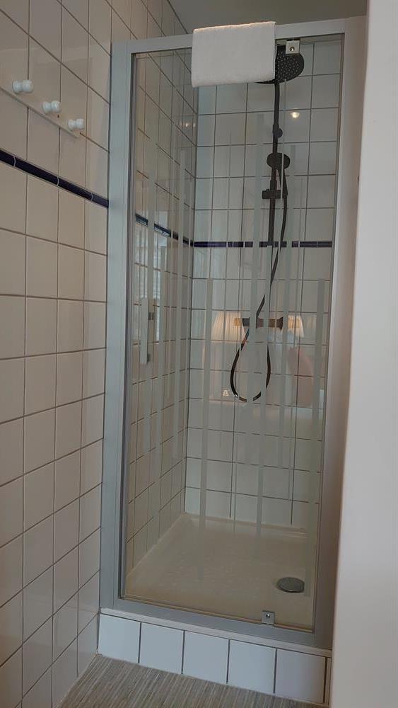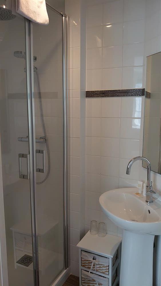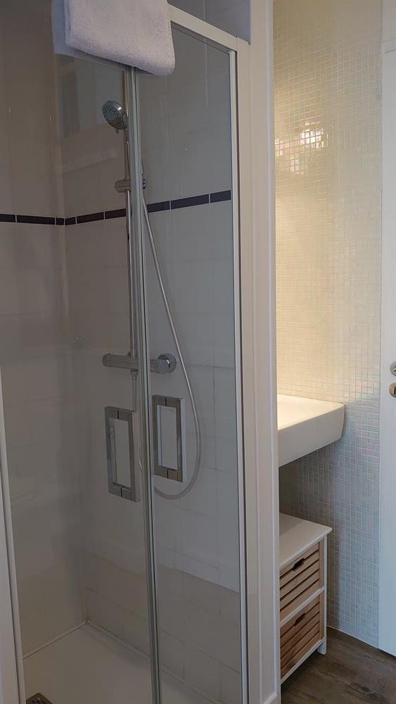 - Salle d'eau : douche cabine avec siège et lavabo.
